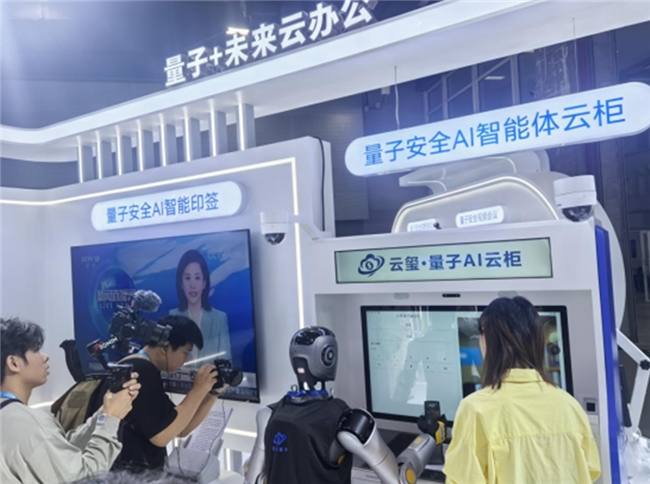 本次盛会,现场展示量子AI智能体文印云柜、量子安全机器人、量子云印章、量子云工牌协同使用,特别是实现量子安全机器人从量子云柜中取出量子云印章,在量子云柜的用印区域完成自动盖印的全流程。这不仅是量子+AI技术上的创新应用,更是标志着云玺量子的未来云办公创新,引领了人类智能办公,实现从碳基生命主导的办公场景,迈向碳基生命与硅基生命协同办公的新阶段,不仅呈现出一系列激进且前卫的产品与技术,更是展现了一种量子安全技术防护下,机器人、智能体终端协同办公的未来场景。