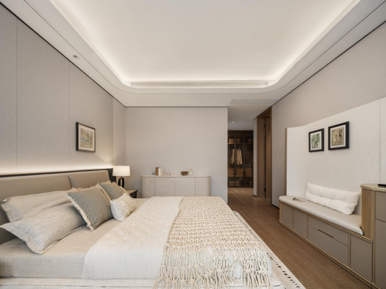 在满足“大家庭”共性居住需求的同时,YUNē 269户型对每位家庭成员的私密与舒适体验,同样考量周全。户型内规划的三间朝南酒店式套房,让孩子、父母与长辈都能拥有专属的南向采光空间,每间套房均配备独立卫浴与收纳区域,有效保障个人隐私,避免日常生活中的不便。约38㎡的总统级主卧套房,更是为业主打造了专属的私密奢享天地,独立衣帽间、双台盆主卫与观景浴缸的组合,搭配南北通透的格局与大面宽阳台,让居家生活充满仪式感。