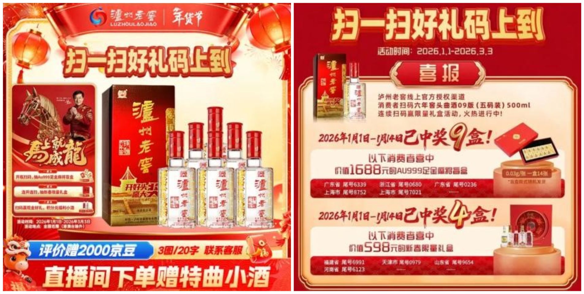 “扫码赢红包”活动进一步强化春节消费的仪式感与趣味性。春节期间,品牌将扫码活动与 节日概念结合,在瓶盖内码设计中加入创新奖品,用户扫码时不仅能赢取2元-1000元现金红包,还能有机会获取足金盲盒,这一创新让“开酒”成为春节团聚中的“小惊喜”。