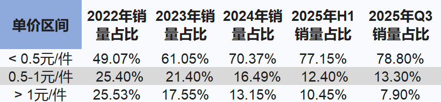 结果大家都看得见:单价1元以上的高价值产品占比从25.53%一路跌到2025年三季度的7.9%,公司的低端业务占比急剧放大。