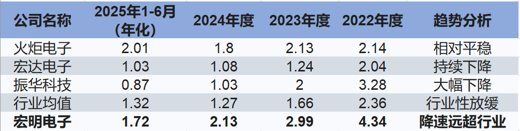 宏明电子与同行业可比公司应收账款周转率对比(制表:财中社)