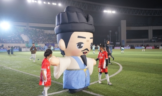 赛事启动仪式于当晚 19 时正式拉开帷幕。400 人共同演绎的歌舞《牡丹之歌》率先点燃现场氛围,随后原创歌曲演唱、管弦乐表演、红歌联唱等精彩节目轮番登场,演员们以饱满的热情为观众呈现了一场沉浸式视听盛宴。值得关注的是,王阳明主题人偶在仪式中惊喜亮相,并为揭幕战开球,这一设计既融入了修文当地的历史文化元素,也为赛事赋予了浓厚的地方文化内涵。